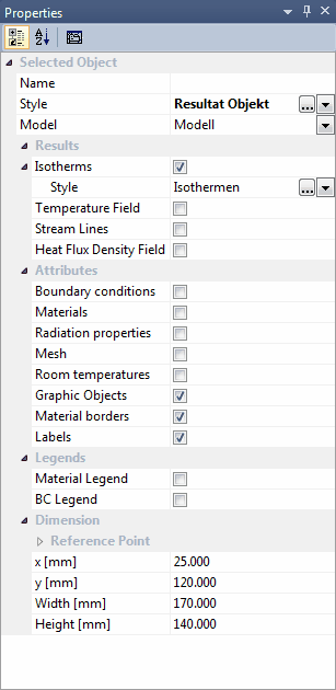 If additional legends, attributes or global results like isotherms need to be shown, you can adjust the object in the Result Object Properties dialog window. You can access the Result Object Properties dialog window by right clicking and choosing context menu command Properties, with the menu command Edit.Properties, or by hitting Alt + Return. Alternatively you can adjust the properties directly in the Properties flyout (cf. figure 1).